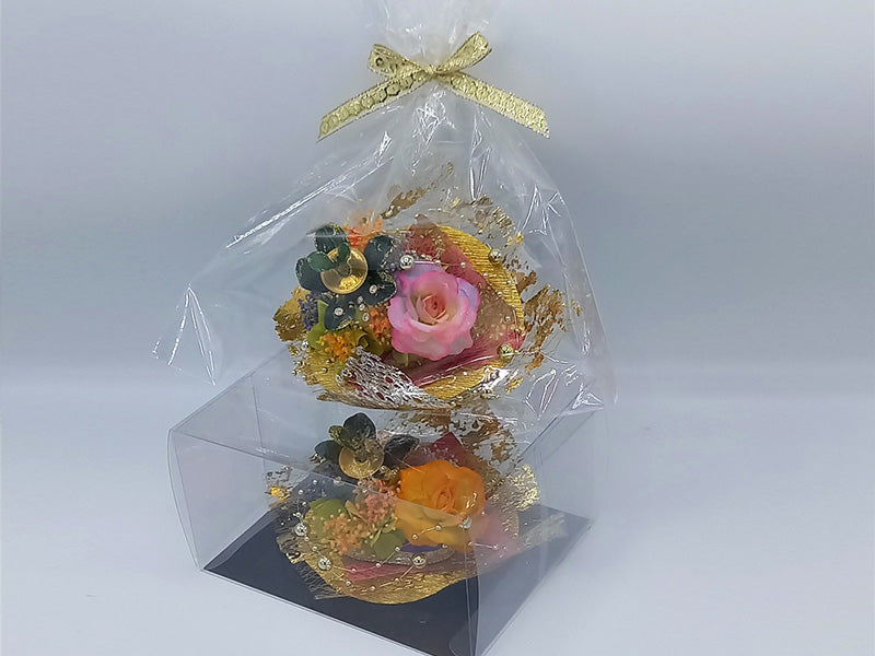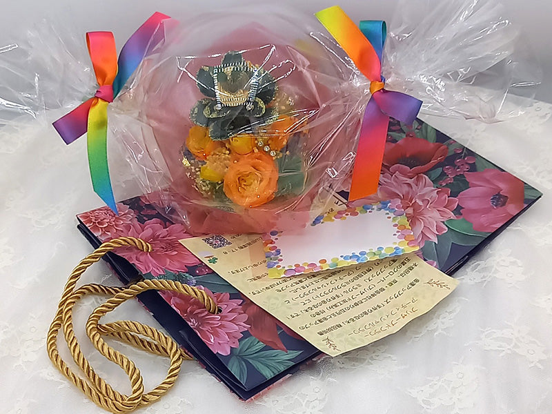 K02. 「手作り金のなる木」&レインボーローズ(造花)miracleプチブーケアレンジ