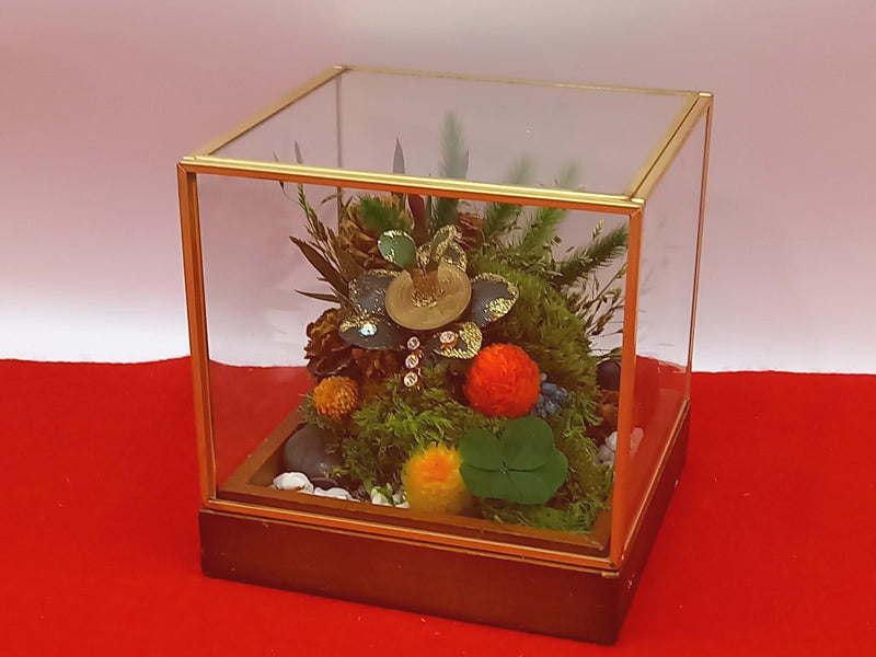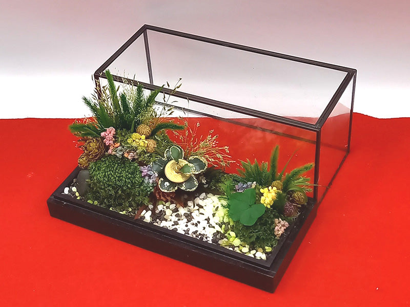 K08. 「手作り金のなる木」&オールプリザーブドフラワー苔と野草類のテラリウムアレンジメント