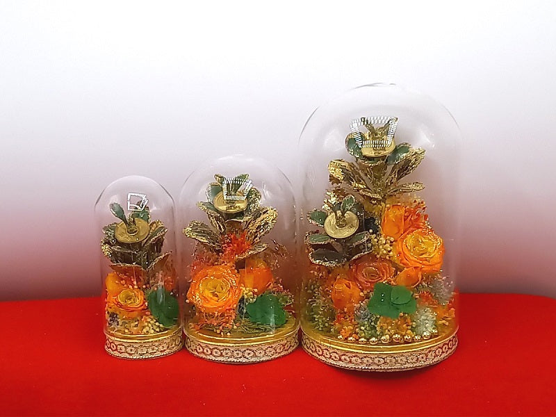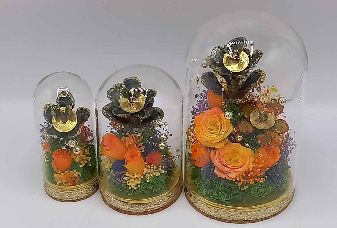 K05. 「手作り金のなる木」&プリザーブドフラワーレインボーローズ(2色)ガラスドームアレンジ