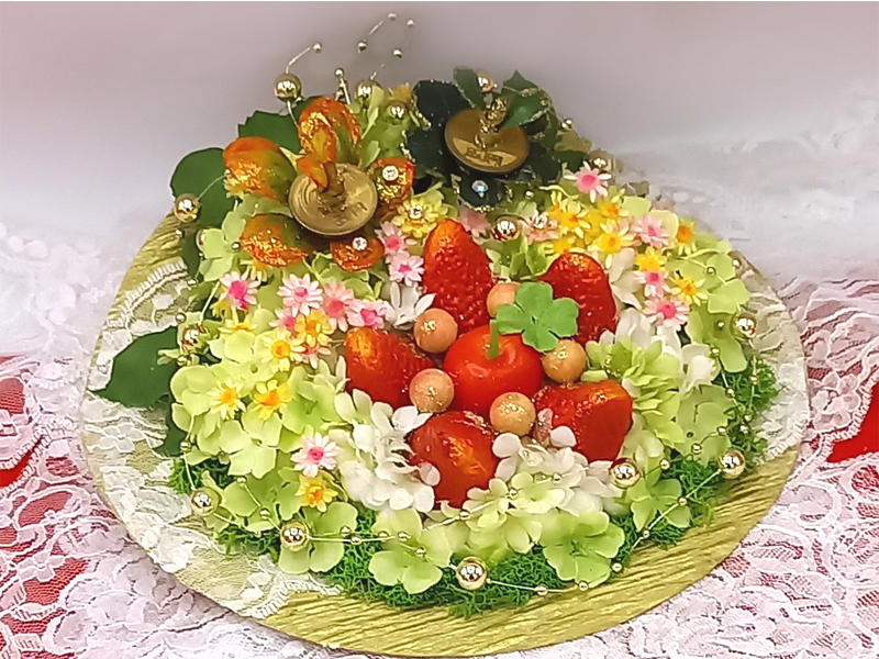 K06.金運アップグッズ「手作り黄金姫花月金のなる木」&フェイクフルーツ花ケーキ風アレンジ❣